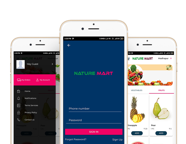 Nature Mart, local Fresh fruits and vegetables delivery app serving in and across hyderbad. This app possess mutliple integrations like google maps, payment gateway, OTP verification, dynamic customer alerts using the push notifications. This is an hybrid app, Developed using Ionic Angular.