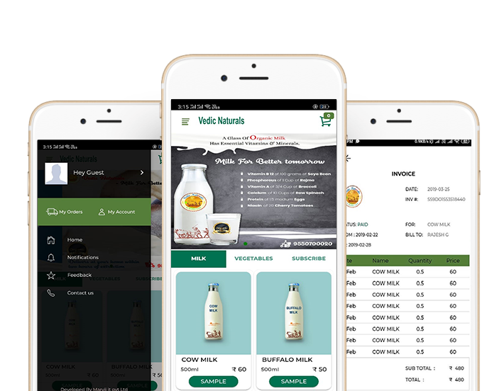 Vedic naturals is an organic milk and vegetables delivery app. Delivers fresh organic milk and vegetables in and across Hyderabad. It has lot deeper functionality like managing subscriptions, invoices , notifications and monthly payments. This is an hybrid app , Developed using Ionic Angular.